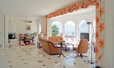 Eine direkte Zufahrt führt in die grosse Garage und mittels einer Treppe gelangt man in die offene Versace-Küche und den Wohn-Essbereich (Erdgeschoss). Im 1. Stock sind 3 grosse Schlafzimmer mit 2 Baedern. Der schönste Ausblick geniesst man von der 40 m2 grossen, gedeckten Terrasse (2.Stock), welche sich zuoberst auf dem Turm befindet. Mahlzeiten können jederzeit in der anliegenden, komplett eingerichteten Küche zubereitet werden. Im Untergeschoss gibt es eine kleine Anliegerwohnung mit Rustico und Grottino, gedecktem / offenen Schwimmbad, Sauna, etc.